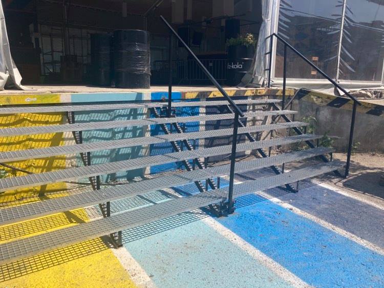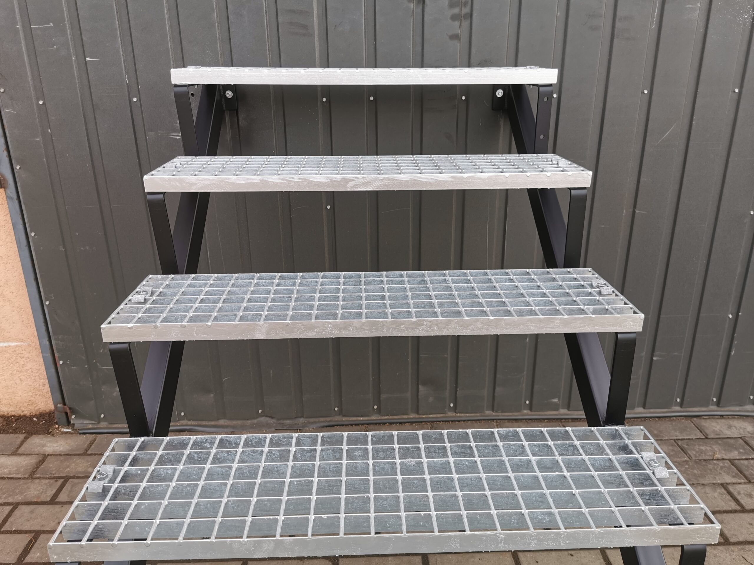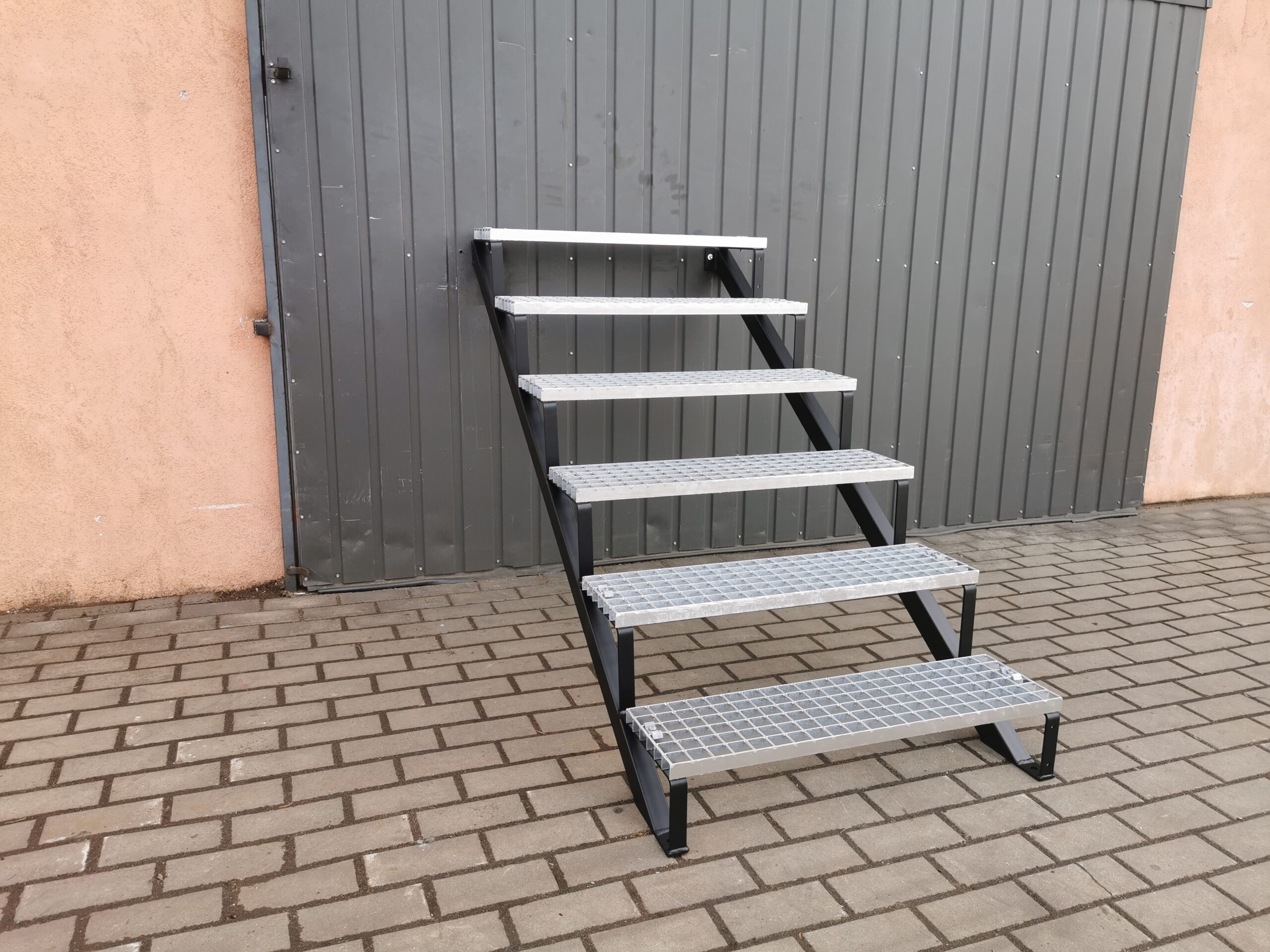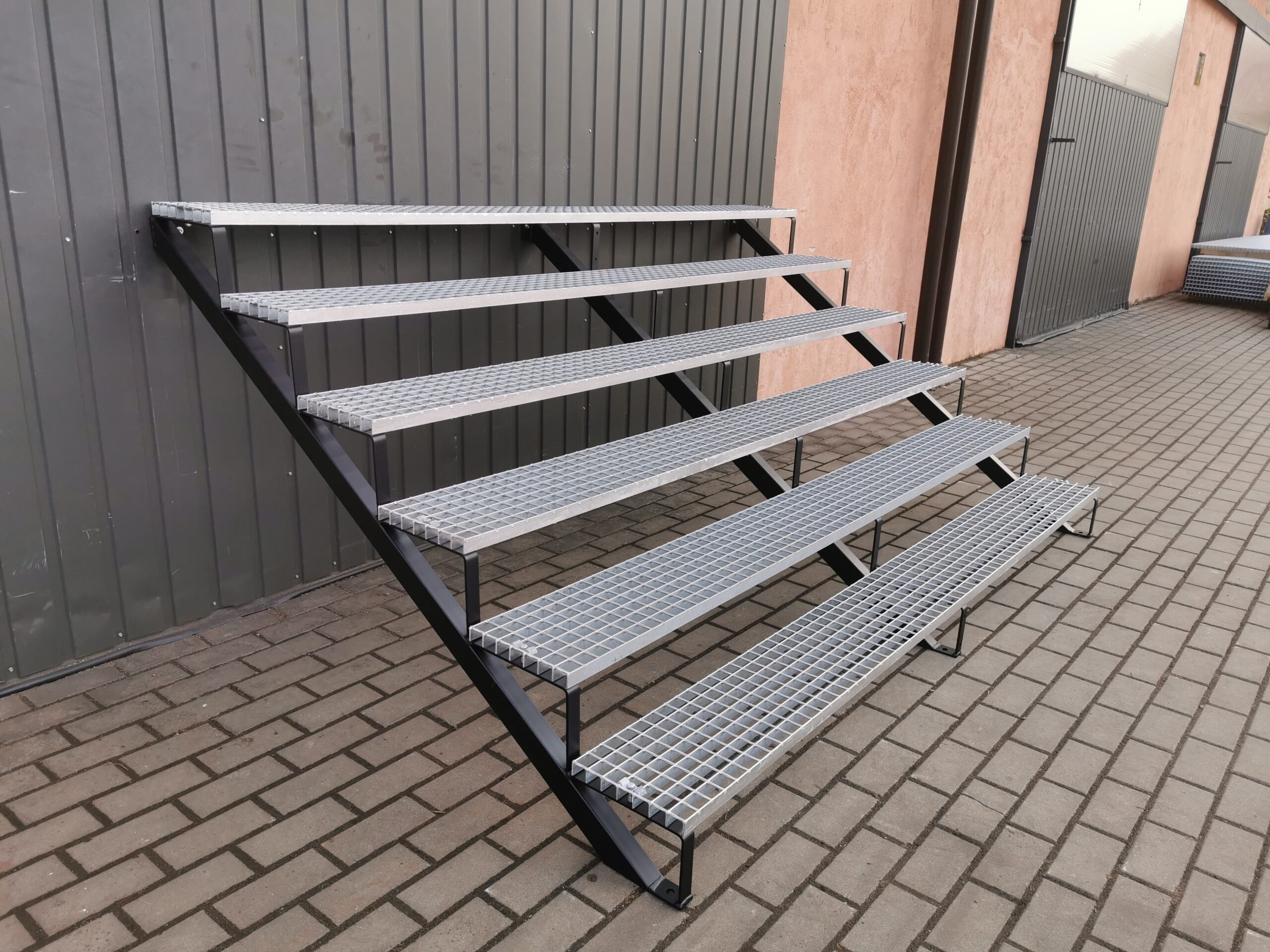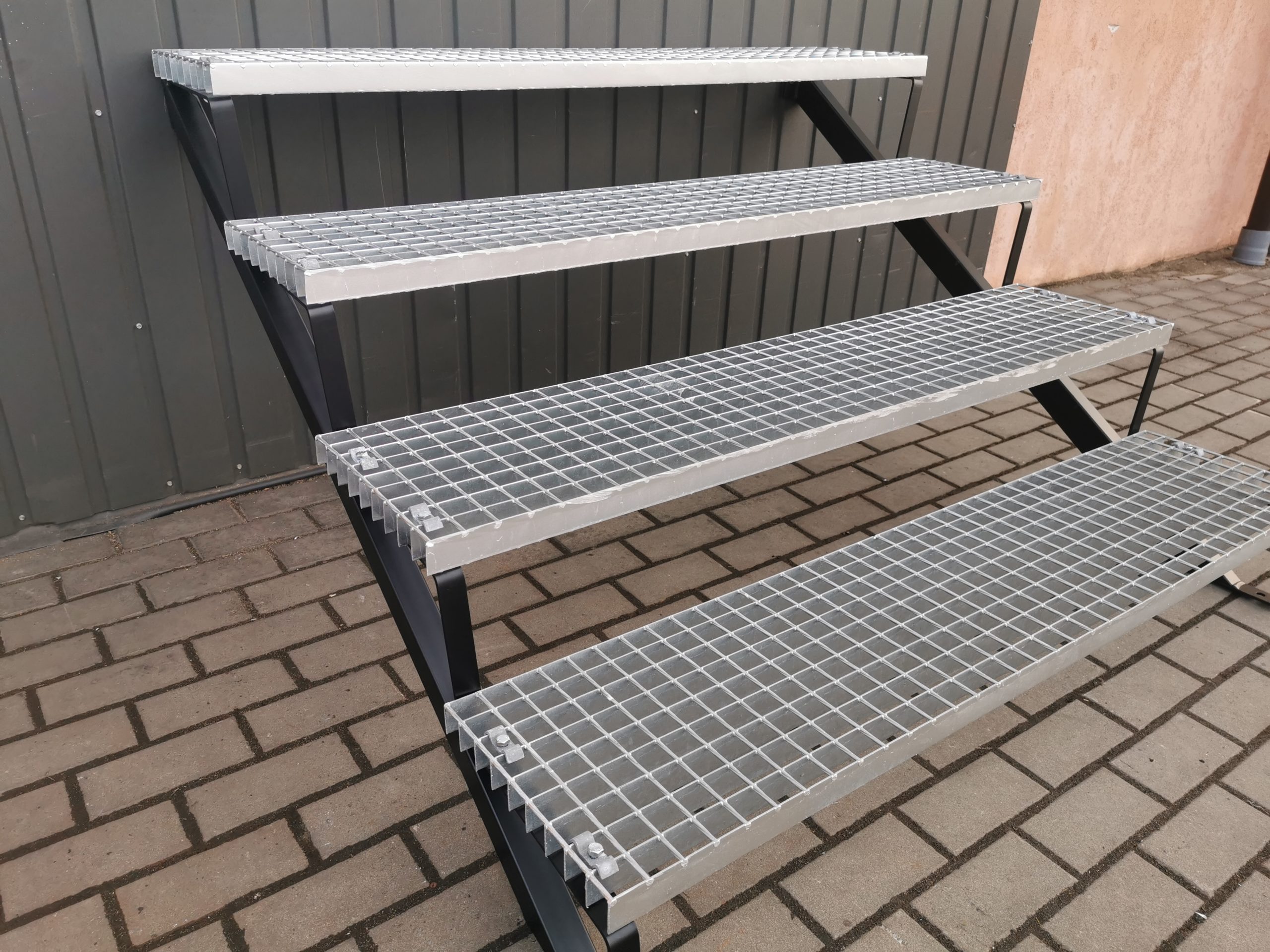 Schody są wykonane z ocynkowanej kraty WEMA, a konstrukcja nośna z profila i płaskownika. Konstrukcja stalowa malowana natryskowo.